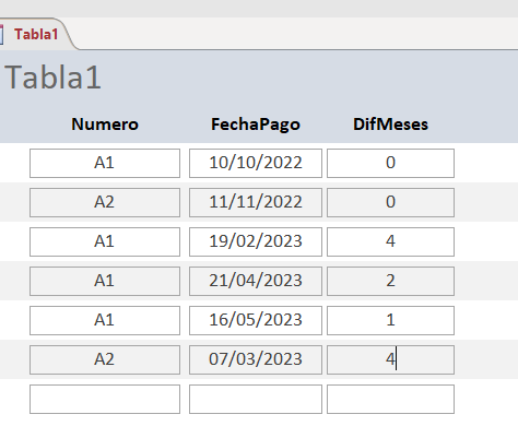 MesesRetraso: ((Nz(DifFecha("m";[Fecha_Pago];DÚltimo("Fecha_Pago";"Cobros__2";"Fecha_Pago <#" & [Fecha_Pago] & "#")))))*-1