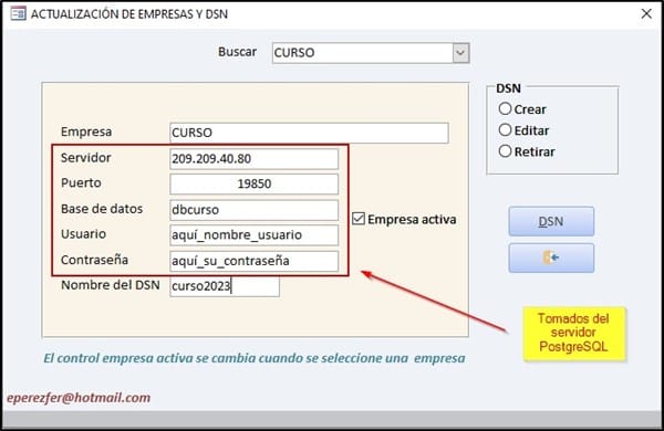 Private Sub btnDSN_Click() Dim mDSN As Boolean If IsNull(Me.opcDSN) Then MsgBox "Debe indicar el proceso a realizar con el DSN", vbInformation, "Error ..." Exit Sub End If mDSN = CreatePostgreSQLDSN(Me.dsn, Me.servidor, Me.puerto, Me.basedatos, Me.usuario, Me.contrasena, Me.opcDSN) If mDSN Then If Me.opcDSN = 1 Then MsgBox "DSN creado satisfactoriamente", vbInformation, "DSN" ElseIf Me.opcDSN = 2 Then MsgBox "DSN editado satisfactoriamente", vbInformation, "DSN" Else MsgBox "DSN Eliminado satisfactoriamente", vbInformation, "DSN" End If End If End Sub