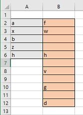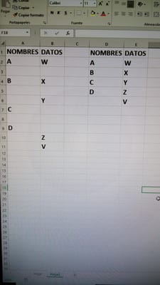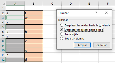 La tabla inicial es de dos columnas; las filas tienen celdas vacías; lo que quiero es ir subiendo las celdas con contenido (eliminando las vacías) para quedar una tabla como la indicada en la derecha de la imagen.