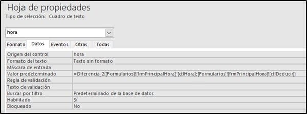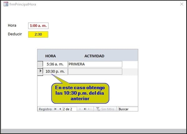 La idea es que el valor del cuadro texto del subformulario sea dos horas y media menos que el del formulario principal..