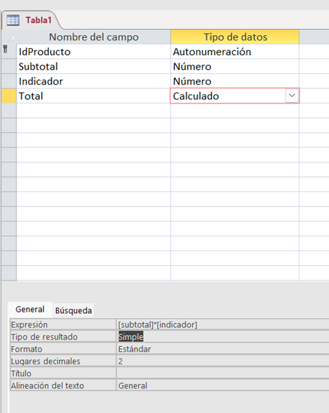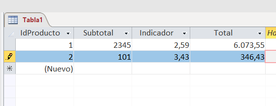 Necesito calcular en mi tabla en un campo calculado la multiplicación del valor de la celda anterior * 2.59. Me da un resultado alterado, incorrecto cuando lo compruebo con la calculadora de mano. Tengo un campo SUBTOTAL, establezco otro campo que se llama INDICADOR de valor 2.59 y se deben multiplicar ambos para dar el TOTAL.