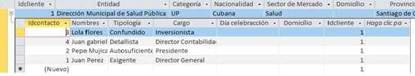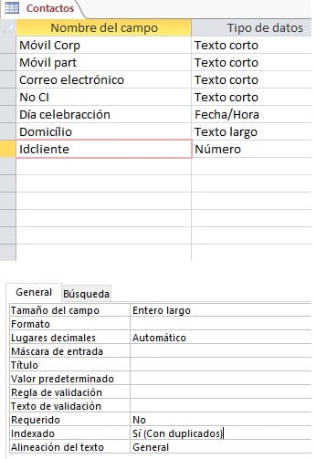 Tengo una BD en Access que desde las tablas se trabaja bien. Cuando a mi tabla 1 CLIENTES le lleno un registro con nombres y apellidos de los clientes, como es normal me muestra el registro de la tabla 2 CONTACTOS y automáticamente carga bien el ID de la relación correspondiente a la tabla 2 como se ve en la imagen siguiente: