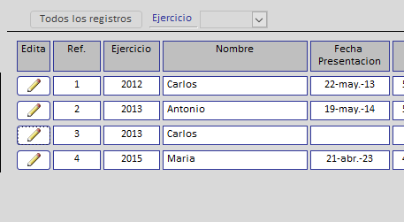 Por el cuadro combinado Ejercicio puedo hacer un filtrado por Ejercicio, pero lo que me encuentro es que al querer filtrar por ejercicio me aparecen todos los registros tanto de Carlos, María y Antonio.