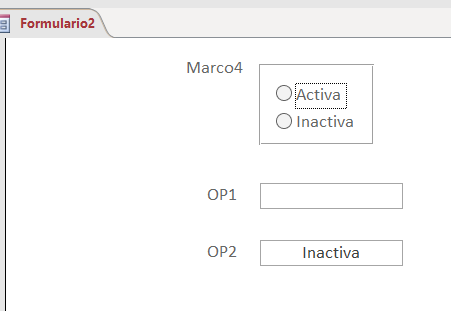 Tengo un formulario que tiene un cuadro con dos botones de opción "Activa" e "" Inactiva", al seleccionar cualquiera de las dos opciones este se guarda en el campo de la tabla op1 como un valor numérico (Activa=1, Inativa=2), pero quiero que al mismo tiempo se guarde en otro campo denominado op2 como texto. Se que podria usar if y then, pero no se como ser;ia la sintaxis.