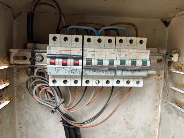 Veo que no tienes neutro (conectado, pero he visto entre el amasijo de cables de la foto un tierra (amarillo/verde) y un cable verde, que podría ser el neutro, seguramente la línea de entrada sean los tres cables de las 3 fases (negro, gris y marrón) y si ese cable de acometida, viene con el verde, muy probablemente sea el neutro.