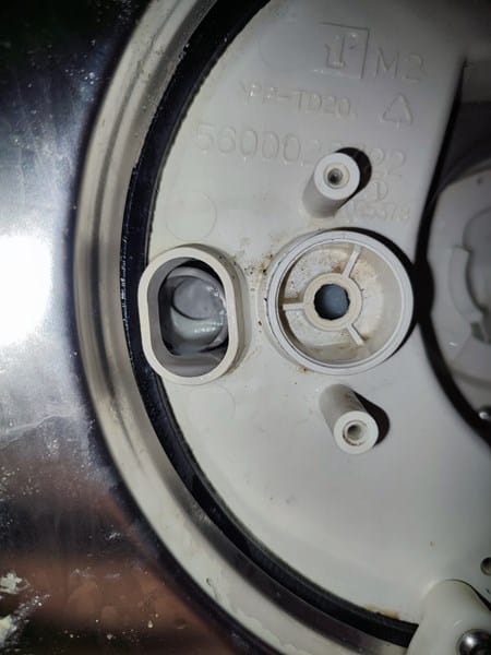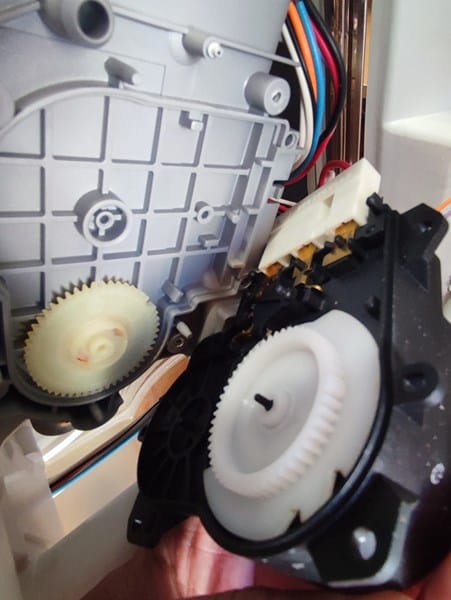 Al desmontar el lavavajillas vi que esta parte formaba parte del kit de la resistencia. La rueda está en el interior de la zona de las dos salidas de agua.