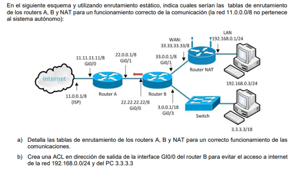 En el siguiente esquema y utilizando enrutamiento estático, indica cuales serían las tablas de enrutamiento de los routers A, B y NAT para un funcionamiento correcto de la comunicación (la red 11.0.0.0/8 no pertenece al sistema autónomo). Muchas gracias por su ayuda!