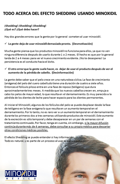 Hace unos 8 meses, me realicé un trasplante capilar, al hacérmelo me mandaron como medicación una pastilla diaria de formula magistral que contenía 2.5mg de minoxidil y 0.5mg de dutasteride, en la ultima revisión que tuve hace unas dos semanas, me cambiaron la dosis del minoxidil a 5mg, dejando igual el dutasteride, y la toma igual, una pastilla diaria. Llevo tomando la pastilla con esta nueva dosis unos diez días, ¿es posible que aparezca de nuevo el efecto shedding? Me comentaron que si, que al cambiar la dosis aparecerá de nuevo. Si es así, cuando lo empezaría a notar y durante cuanto tiempo.