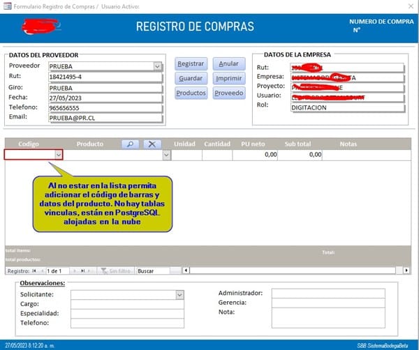 MsgBox "Por favor seleccione un código de la lista", vbInformation, "Registrando Compra"