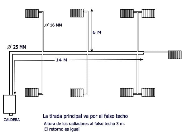 Sería poner la tirada principal a 25 mm de diámetro y las derivaciones a los radiadores 16.