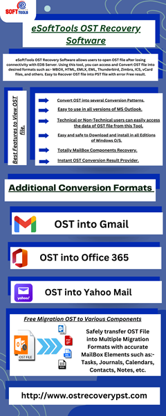ESoftTools OST Converter Software solves any issues regarding OST file opening. It is the best Software to Open OST file by which you can Convert OST to PST with all MailBox elements such as:- Contacts, Emails, Calendars, Journals, Tasks, etc. It also provides several migration Formats for the conversion of OST file into PST, HTML, PDF, ICS, Zimbra, MBOX, EML, EMLX, Gmail, G-Suite, Yahoo Mail, Outlook. Com, etc. Supports any Editions of Windows and MS Outlook versions.