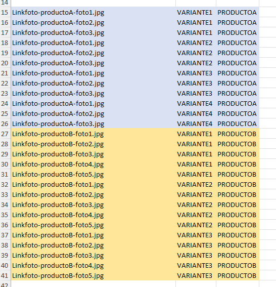 Tengo en una columna de Excel cierta cantidad de links de unas fotos, las cuales debo asignárselas a unos productos que tienen diferentes variantes, muestro un ejemplo: