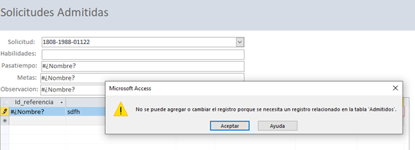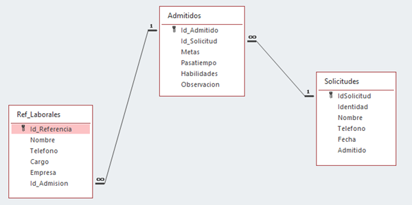 Tengo las tablas SOLICITUDES (id_solicitud, identidad, nombre, fecha_solicitud, teléfono, y Admitido(admitido es un campo casilla)), ADMITIDOS (id_admitido, id_solicitud, metas, pasatiempos, habilidades, observación), REF_LABORALES (id_referencia, Id_admitido, nombre, teléfono, cargo, empresa).