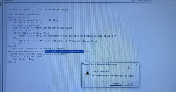 Tengo este codio con un command button al apretarlo me aparece el calendario data picker pero en ingles, yo quisiera que fuese en español y que al abrirlo se posicione el la fecha actual