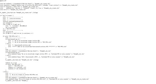 @echo off echo +----------------------+ echo ^| Lista de Archivos echo +----------------------+ setlocal enabledelayedexpansion set contador=1 (for /R %%X in (*.mp3) do ( echo ^| !contador!. %%~nX%%~xX set /a contador+=1 )) > "MIS MP3s.txt" echo +----------------------+ set canciones=0 for /R %%A in (*.mp3) do set /a canciones += 1 if %canciones% equ 0 ( echo ^| No se ha encontrado ningún archivo MP3 echo ^| No se ha encontrado ningún archivo MP3 >> "MIS MP3s.txt" ) else ( echo ^| %canciones% archivos mp3 echo ^****** TXUS Se han encontrado %canciones% archivos MP3 ********* >> "MIS MP3s.txt" ) echo +----------------------+ echo Set objShell = CreateObject("WScript.Shell") > "%temp%\_vbs.vbs" if %canciones% equ 0 ( Echo objShell.Popup "No se ha encontrado ningún archivo MP3", 3, "Cantidad MP3 en esta carpeta" >> "%temp%\_vbs.vbs" ) else ( echo objShell.Popup "HAY [ %canciones% ] MP3", 3, "Cantidad MP3 en esta carpeta" >> "%temp%\_vbs.vbs" ) %__AppDir__%cscript.exe "%temp%\_vbs.vbs" //nologo timeout /t 3 >nul start "" "MIS MP3s.txt" timeout /t 3 /nobreak > nul taskkill /f /im notepad.exe exit