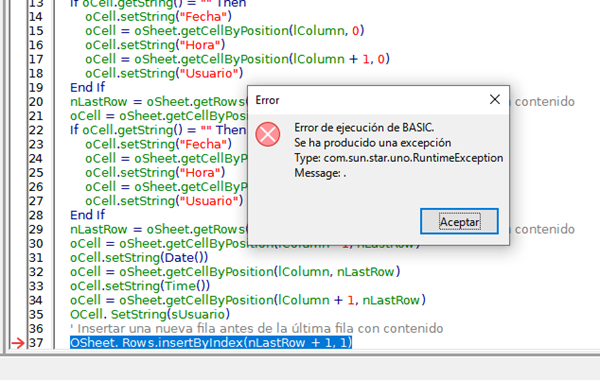 Sub InsertarUsuario() Dim oSheet As Object Dim oCell As Object Dim lColumn As Long Dim sUsuario As String sUsuario = Environ("USERNAME") lColumn = 1 ' Cambia esto al número de la columna donde deseas registrar el usuario oSheet = ThisComponent.CurrentController.ActiveSheet oCell = oSheet.getCellByPosition(lColumn - 1, 0) If oCell.getString() = "" Then oCell.setString("Fecha") oCell = oSheet.getCellByPosition(lColumn, 0) oCell.setString("Hora") oCell = oSheet.getCellByPosition(lColumn + 1, 0) oCell.setString("Usuario") End If oCell = oSheet.getCellByPosition(lColumn - 1, oSheet.Rows.Count) oCell.setString(Date()) oCell = oSheet.getCellByPosition(lColumn, oSheet.Rows.Count) oCell.setString(Time()) oCell = oSheet.getCellByPosition(lColumn + 1, oSheet.Rows.Count) oCell.setString(sUsuario) End Sub