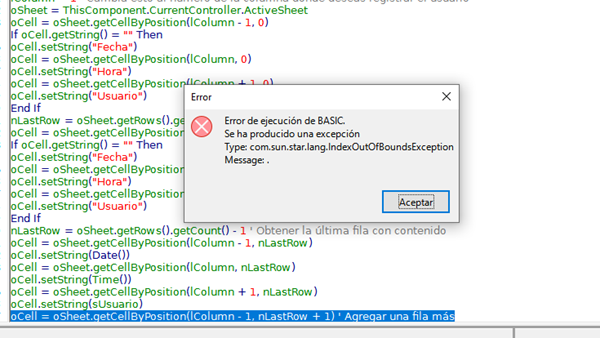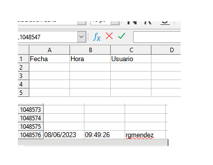 Sub InsertarUsuario() Dim oSheet As Object Dim oCell As Object Dim lColumn As Long Dim sUsuario As String Dim nLastRow As Long sUsuario = Environ("USERNAME") lColumn = 1 ' Cambia esto al número de la columna donde deseas registrar el usuario oSheet = ThisComponent.CurrentController.ActiveSheet oCell = oSheet.getCellByPosition(lColumn - 1, 0) If oCell.getString() = "" Then oCell.setString("Fecha") oCell = oSheet.getCellByPosition(lColumn, 0) oCell.setString("Hora") oCell = oSheet.getCellByPosition(lColumn + 1, 0) oCell.setString("Usuario") End If nLastRow = oSheet.getRows().getCount() - 1 ' Obtener la última fila con contenido oCell = oSheet.getCellByPosition(lColumn - 1, 0) If oCell.getString() = "" Then oCell.setString("Fecha") oCell = oSheet.getCellByPosition(lColumn, 0) oCell.setString("Hora") oCell = oSheet.getCellByPosition(lColumn + 1, 0) oCell.setString("Usuario") End If nLastRow = oSheet.getRows().getCount() - 1 ' Obtener la última fila con contenido oCell = oSheet.getCellByPosition(lColumn - 1, nLastRow) oCell.setString(Date()) oCell = oSheet.getCellByPosition(lColumn, nLastRow) oCell.setString(Time()) oCell = oSheet.getCellByPosition(lColumn + 1, nLastRow) oCell.setString(sUsuario) oCell = oSheet.getCellByPosition(lColumn - 1, nLastRow + 1) ' Agregar una fila más End Sub