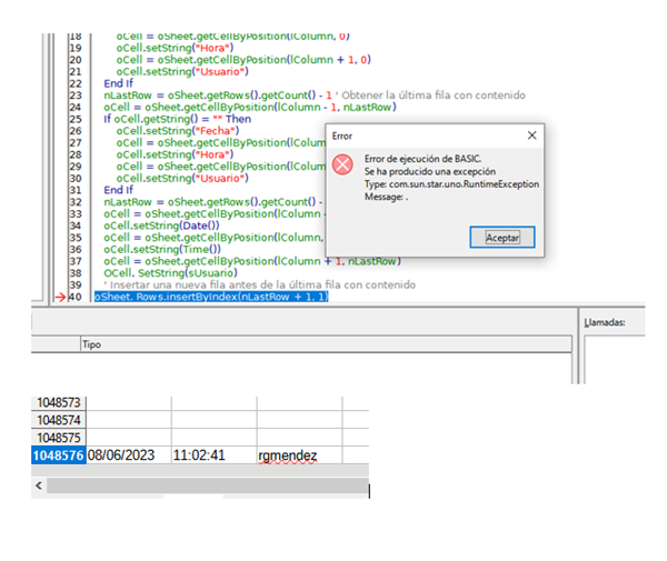 le documente la última línea y ya no muestra el error, pero en la primer fila coloca los encabezados y en la última fila registra la fecha, hora y usuario.