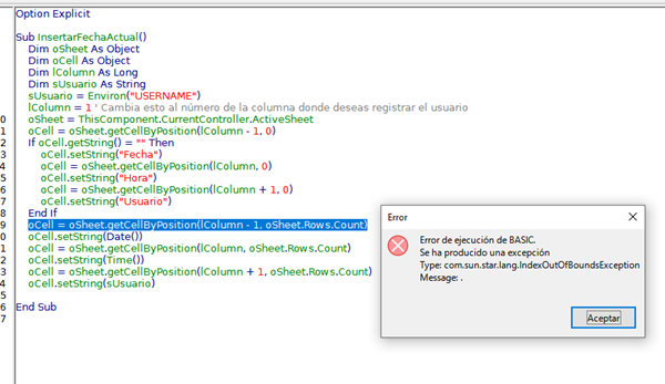 Una disculpa, te proporcionaré un ejemplo de código que puedes utilizar en LibreOffice para registrar el usuario de Windows junto con la fecha y hora en que se modifican los datos de una columna: