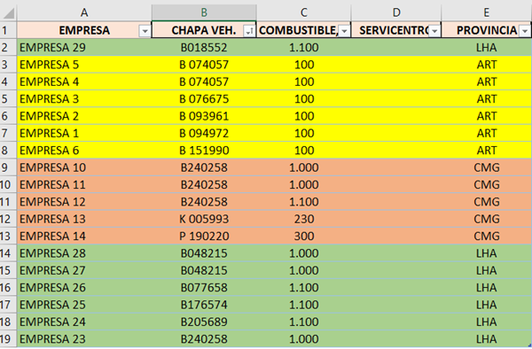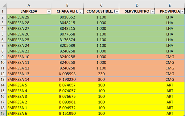 El código que estoy utilizando es una modificación del que hice con la grabadora de macros. Son X columnas: Empresa, chapa, combustible, servicentro y provincia. El orden de ordenacion es: provincia, empresa, servicentro