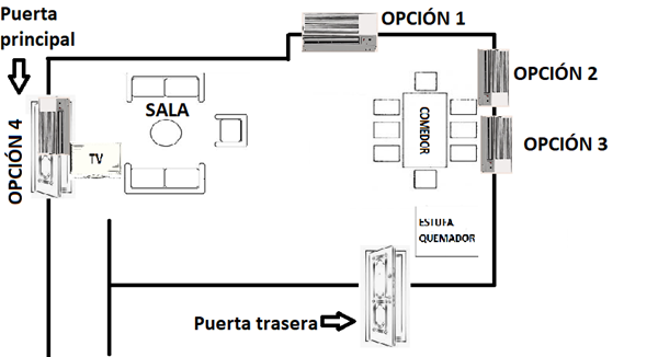 Opción 4:tiene la misma desventaja que la opción anterior, pero creemos que el mayor impacto de frío lo recibiría la mesa o comedor, igualmente, creemos que el pasillo recibiría menos ventilación por apuntar en sentido contrario.