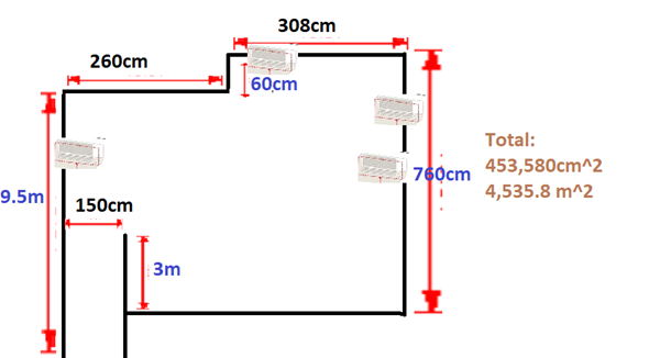El área a instalar se compone de la sala, comedor o mesa grande, cocina, y un pasillo que conecta con el cuarto y baño (el clima solo va a enfriar el pasillo, el dormitorio y baño permanecerán cerrados, por lo que no se dibujó en el croquis).