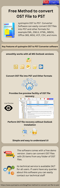 SysInspire offers the most amazing Microsoft OST to PST Converter free tool. It will make importing Outlook OST files into PST easier. SynsIpire OST to PST converter Software is the best and most creative conversion solution for effortlessly exporting all data from Outlook OST files to PST and 13+ other conversion formats without using Outlook. It offers a bulk conversion function that allows users to convert and restore several OST files at once. And the thing about this too is that it shows you a live preview during its OST recovery.
