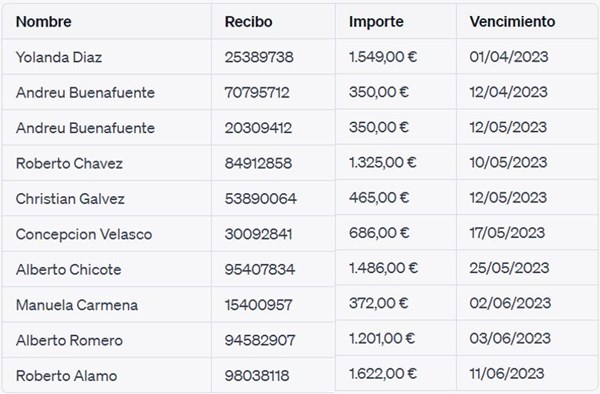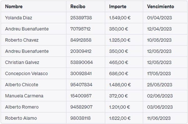 Como veis, lo que necesito es que los recibos más antiguos se sitúen en la parte superior, pero si alguno de esos recibos corresponde a un cliente que tenga dos o más recibos, estos aparezcan justamente en las filas siguientes, independientemente de su fecha de vencimiento.