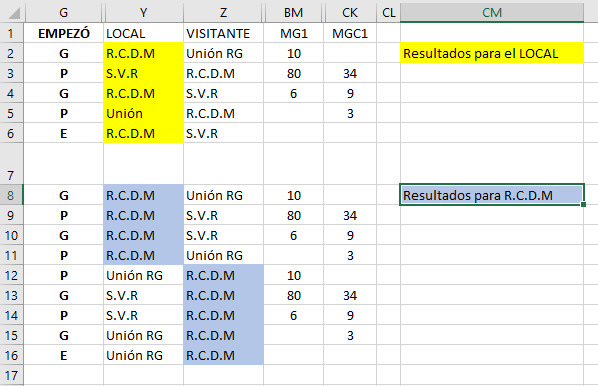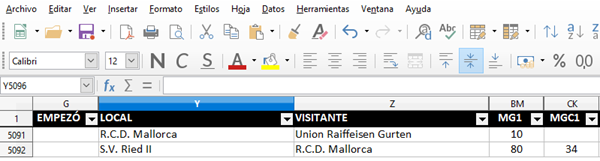 Las celdas BM y CK indican los minutos del primer gol de Y y Z respectivamente, pero pueden estar en blanco (si no hubo gol de ese equipo y ser considerados como 0).