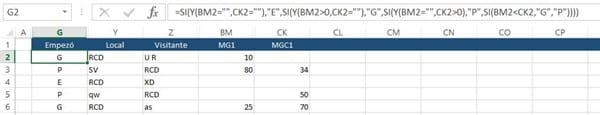 Busco una fórmula que me calcule en la columna G si el R.C.D. Mallorca empezó Ganando (g), Perdiendo (p) o Empatando (e) el partido tras el primer gol (lógicamente la "e" solo será cuando acabó 0-0).