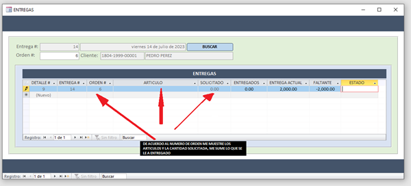 Ahora lo que necesito es que, en el formulario de entregas, al ingresar el número de orden, me aparezca los artículos y las cantidades solicitadas que pertenecen a esa orden, el acumulado de lo que se va entregando, la entrega actual y lo pendiente.