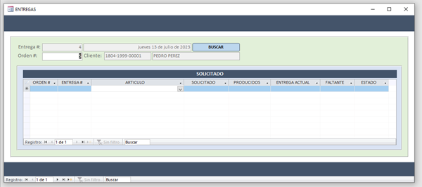 Esto lo pretendo realizar en el formulario entregas, ingresando el # de orden de fabricación, pero no logro que el subformulario me visualice el pedido de la orden.