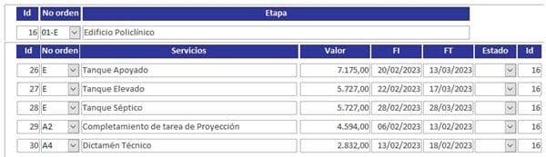 Tengo una BD en Access con una tabla ETAPA Y otra tabla SERVICIOS. Ambas relacionadas entre sí. A continuación muestro la vista formulario;
