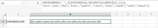 Por ejemplo quiero convertir el numero 2441881812106 en lo siguiente: dos cuatro cuatro uno ocho ocho uno ocho uno dos uno cero seis.