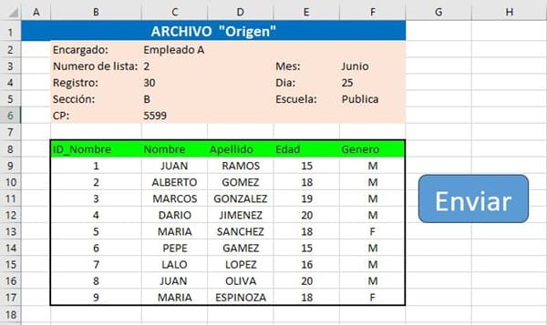 II.- Al dar clic al botón enviar, del archivo Origen, copie los valores del rango B9:F17 y vaya al archivo Destino, donde busque la última celda vacío y pegue los valores del archivo origen y que se vayan almacenando cada que se dé clic al botón enviar.