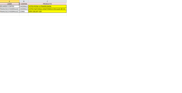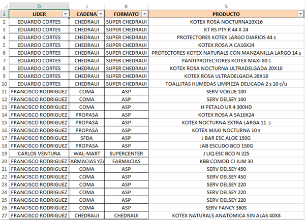 Tengo una base de datos y quisiera saber si hay forma de obtener con función de Excel, el Producto (columna S) que más se repite, ya sea por Líder (columna D) y Cadena (columna J):