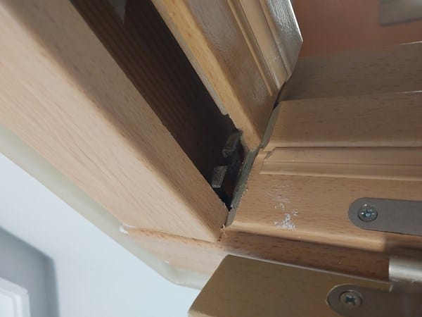 Se me ha soltado la parte de arriba de la puerta del salón. Tiene dos pestañas de metal en la parte fija que hay que apretar para encajar el dintel, pero está muy duro y no termino de meterlo. ¿Alguna idea?