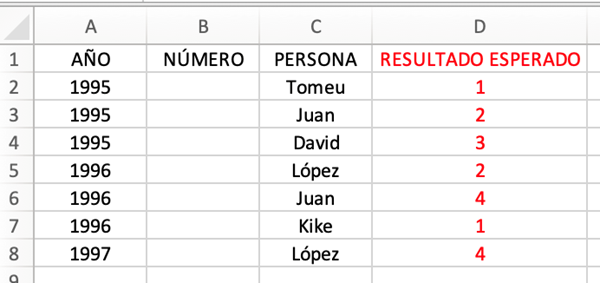 En la segunda, llamada 'Número' deseo calcular en la columna B el número tomando los datos de la hoja 'Años' que coincidan con la persona y el año.