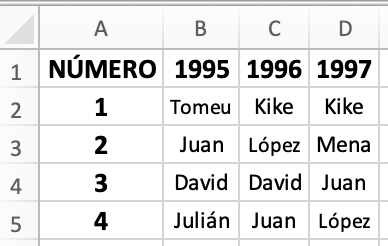 En la hoja Años nunca coinciden dos nombres idénticos en el mismo año, pero sí pueden coincidir en años distintos.
