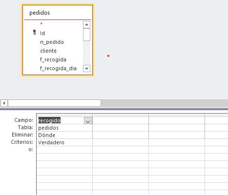 Tengo una tabla donde existe un campo llamado Recogido, lo que pretendo en borrar los registros marcados como recogidos, para ello he generado una consulta de eliminacion que adjunto pero no me elimina