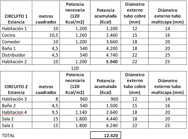 Teniendo en cuenta que el diámetro del tubo principal al radiador (ramal) será de 14 mm (tubo multicapa), los cálculos para los diámetros de la tubería principal de los dos circuidos calculando desde la estancia más lejana a la más cercana de la caldera son los siguientes: