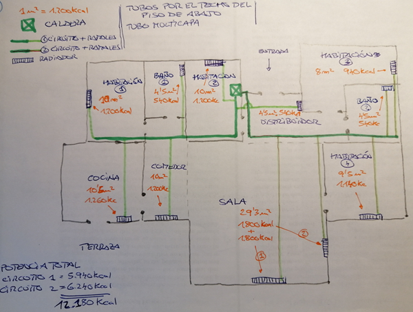 Quiero poner calefacción en una casa a 4 vientos (ventanas con doble cristal) de unos 105 metros cuadrados útiles. 4 habitaciones, 2 baños cocina y sala. La idea es poner una caldera compatible propano / gas natural, ya que en un tiempo van a poner gas natural en la zona de la casa, y poner 11 radiadores de aluminio por agua con una instalación bitubo de dos circuitos de tubos multicapa (no cobre). La casa tiene 2 plantas, la vivienda arriba y abajo estancias que no hay que poner calefacción.. Trastero, garaje... Y pasaré el tubo por el techo de la planta de abajo.