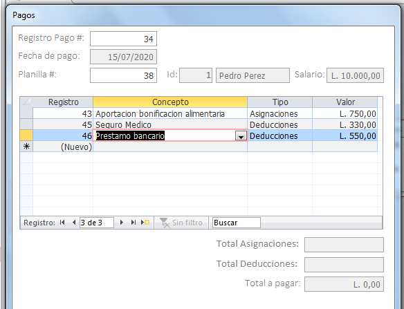 Tengo las tablas Pagos(idpago, Fecha, codplanilla, total) Planillas ( idplanilla, fechainicio, fechafin) empleados (idempleado, nombre) Conceptos (idconcepto, concepto, tipo, donde tipo solo puede ser Asignaciones o deducciones) Detalles (iddetalle, idpago, idconcepto, valor).