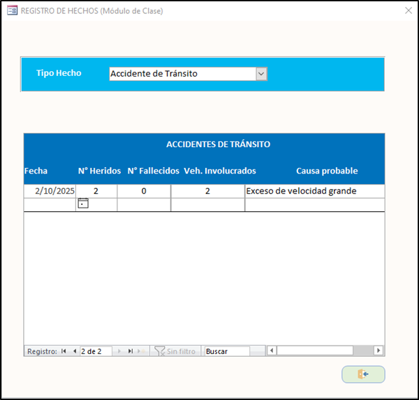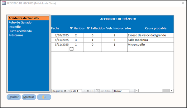 Necesito mostrar un subformulario diferente, según el valor de un campo que llamo "Hecho Extraordinario". Si el hecho es un accidente de transito quiero captar los nombre de los heridos, fallecidos, etc. Si el hecho es un robo de ganado poder captar tipo de ganado, cantidad robada (sacrificada)