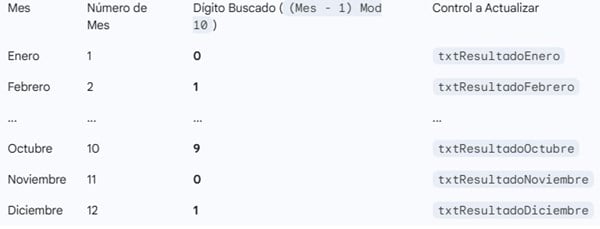 Si prefieres que Noviembre sea el dígito 0 y Diciembre el dígito 1, el código tal como está (usando (mesActual - 1) Mod 10) funciona perfectamente para un ciclo de 10 dígitos.