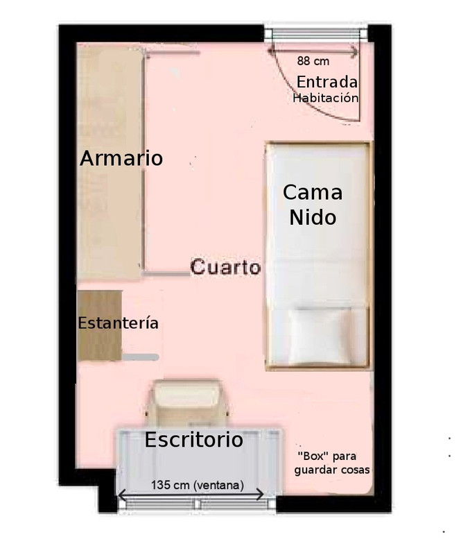 La habitación tendría una cama nido, un armario, un escritorio (quiero poner la mesa más grande que pueda caber sin que esté todo abarrotado), una estantería (es la que está en la esquina) y, si se puede, algo para almacenar cosas varias.