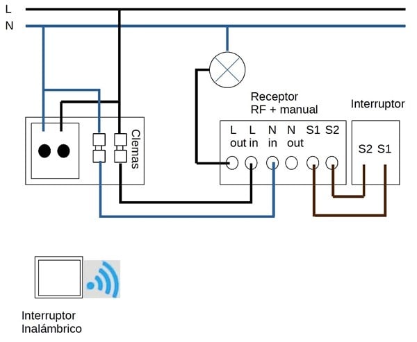 Voy a cambiar el cabecero de la cama y la caja doble va a quedar oculta e inaccesible. Para la toma de corriente usaré un alargador, y para el conmutador se me ocurre poner uno inalámbrico (receptor + interruptor). Pero me gustaría mantener la funcionalidad del conmutador situado junto a la puerta y no tirar nuevos cables por los conductos. He encontrado un receptor+interruptor inalámbrico DieseRC (ref. 2201F) que dice ser compatible con interruptores manuales.
