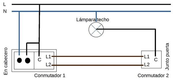Tengo una instalación eléctrica antigua en un dormitorio con una lámpara de techo, un conmutador junto a la puerta y otro conmutador en una caja doble con toma de corriente junto a la cama.