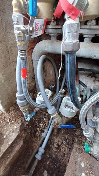 Pedí cambiar la llave y tubo de salida de agua desde el contador, y me han puesto esto, un flexo pero solo hasta la mitad, y luego tubo de plástico gris hasta el tubo que lleva a la vivienda (en la foto: llave azul de esquina superior izquierda).