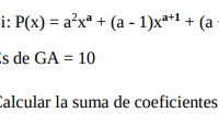 P(x) es igual a a2xa + (a - 1)xa+1 + (a + 1)xa-4 y GA es igual a 10. Calcula la suma de los coeficientes